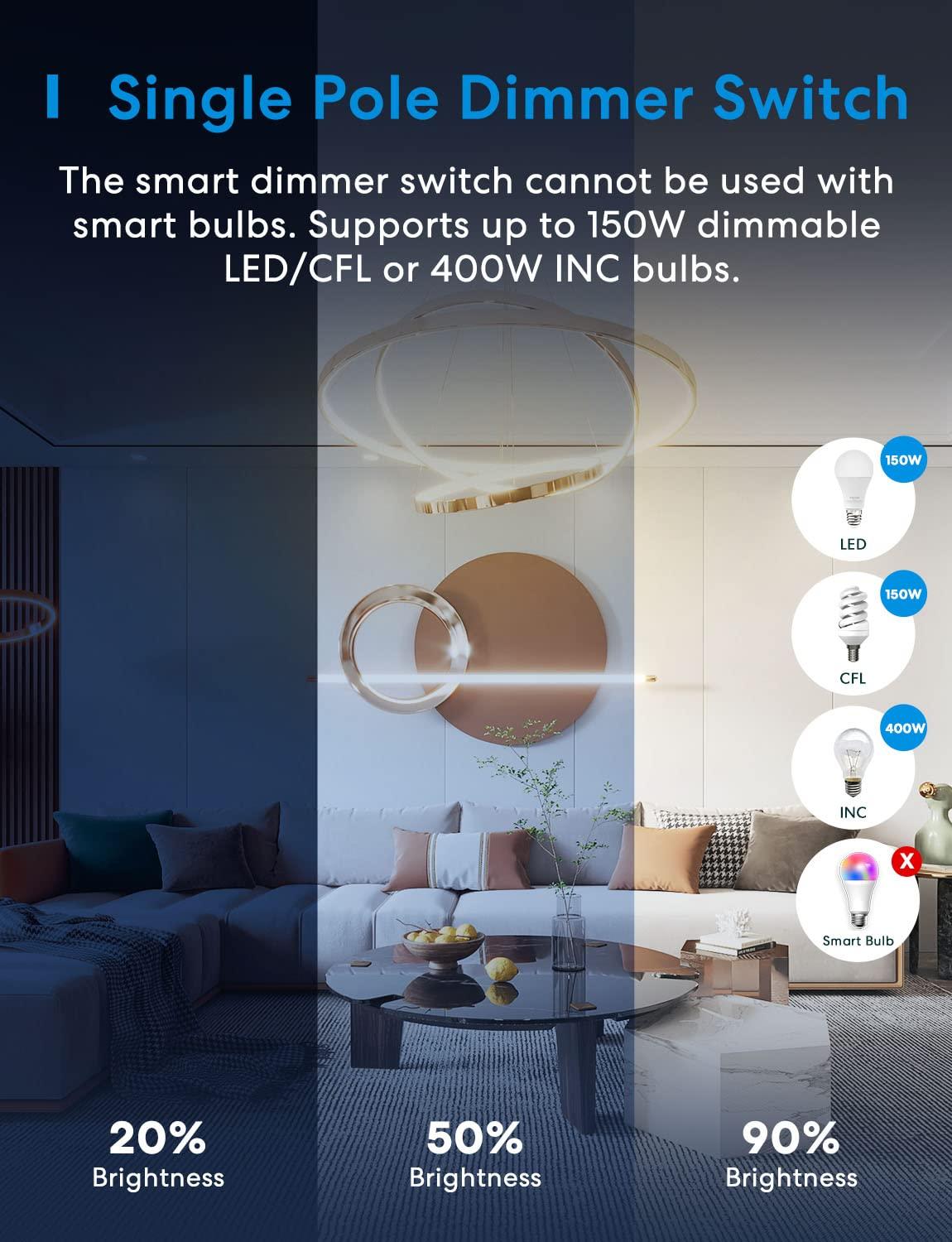 EASY INSTALLATION FOR MEROSS DIMMER LIGHT SWITCH: Install your smart dimmer switch in 15 minutes. Only for single pole installation, (NOT 3-WAY). Meross dimmer wall switch fits for your exisiting 1/2/3/4 gang standard size Decora/GFCI faceplate. The maximum load power is 400W max for INC and 150W max for CFL&LED. The Meross smart dimmer switch works with the 2.4G WiFi only, no hub required. (It does not support 5G WiFi. But normally if you have 5G WiFi, you should also have 2.4G wifi.)