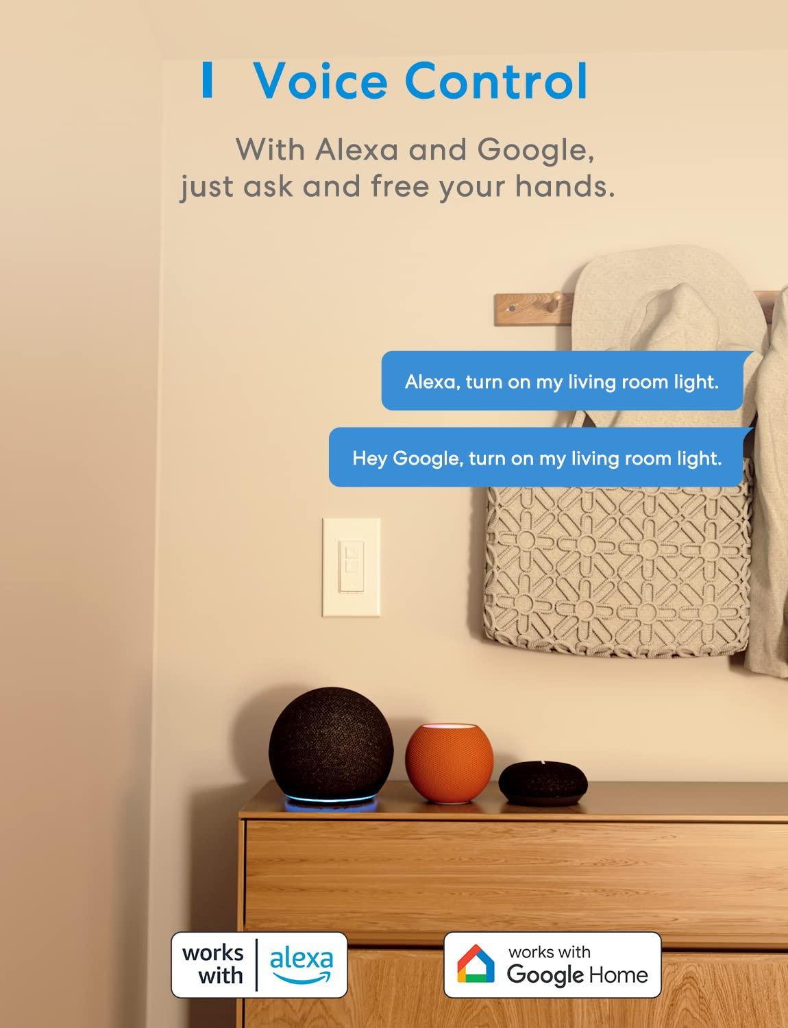SMART DIMMER SWITCH WITH VOICE CONTROL AND REMOTE CONTROL: The WiFi dimmer switch is compatible with Amazon Alexa, Echo, Echo Dot, Google Assistant, Google Home and SmartThings. Turn on/off your light and adjust the brightness simply by voice command. Control the light via your smartphone (iOS or Android) from anywhere with internet anytime. It ONLY supports Meross app.