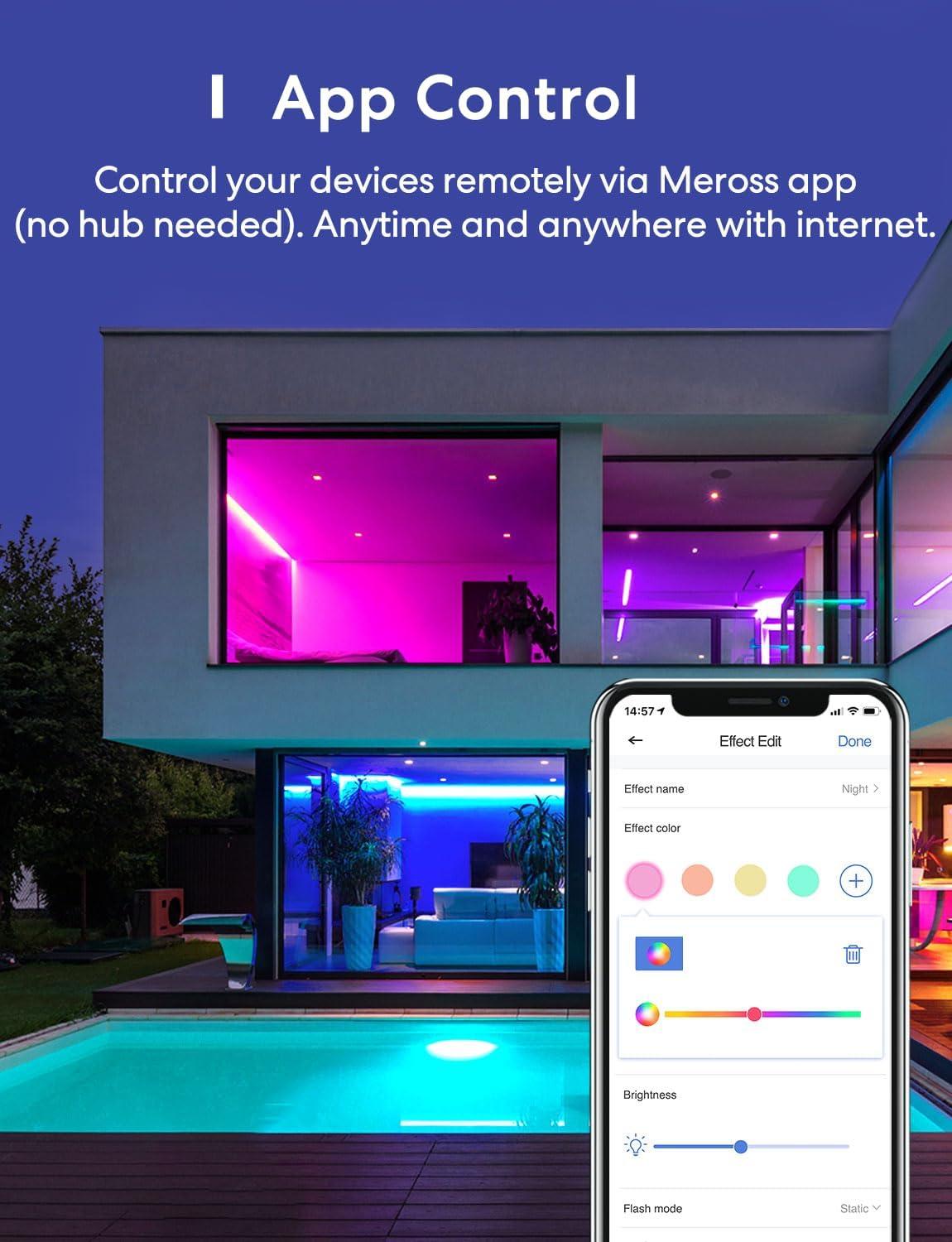 Voice and App Control: Smart light strips are compatible with Apple HomeKit / Alexa / Google Home / SmartThings, you can control them with simple voice commands. And you'll feel more convenient to turn your smart led lights on/off, adjust brightness, or change the colors via Meross app or Home app