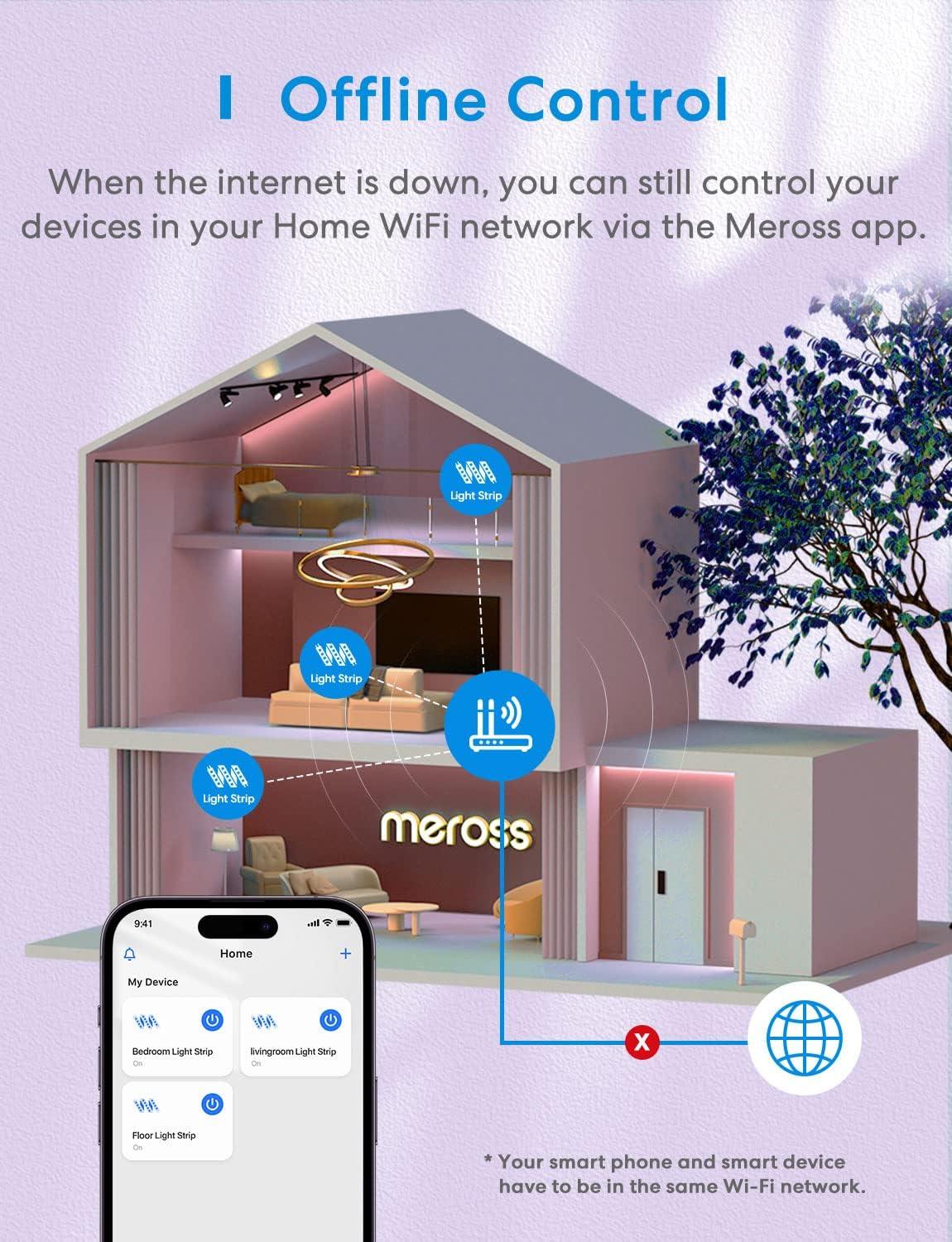 Offline and Local Control: When home network disconnects from the internet, you can still control Meross light strips from Meross app locally. And routine schedule will be stored locally and will still perform even if internet is down
