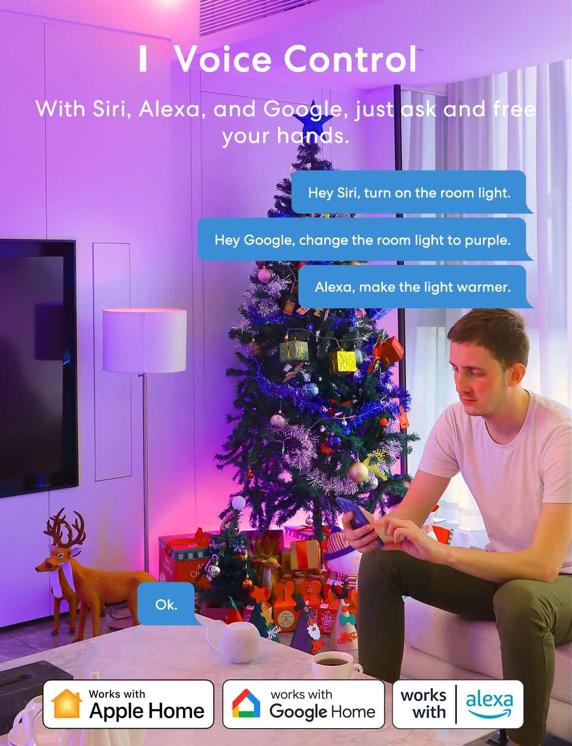 Voice Control: meross smart light bulbs 60 watt compatible with Apple HomeKit, Apple Watch, Siri, Alexa Echo, Echo dot, Google Assistant and SmartThings. Control your alexa light bulb via voice command to turn on/off or dim/brighten your smart LED light effortlessly. (e.g. ‘Hey Siri, set the bedroom light to green’)