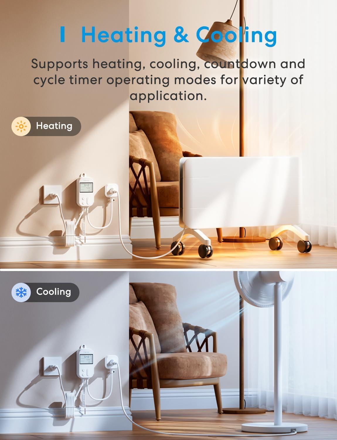 Heating & Cooling: Compatible with various heating and cooling equipment such as infrared heaters, fan heaters, and refrigerators. This smart temperature controller outlet supports Timer working mode, countdown timers and cycle timers
