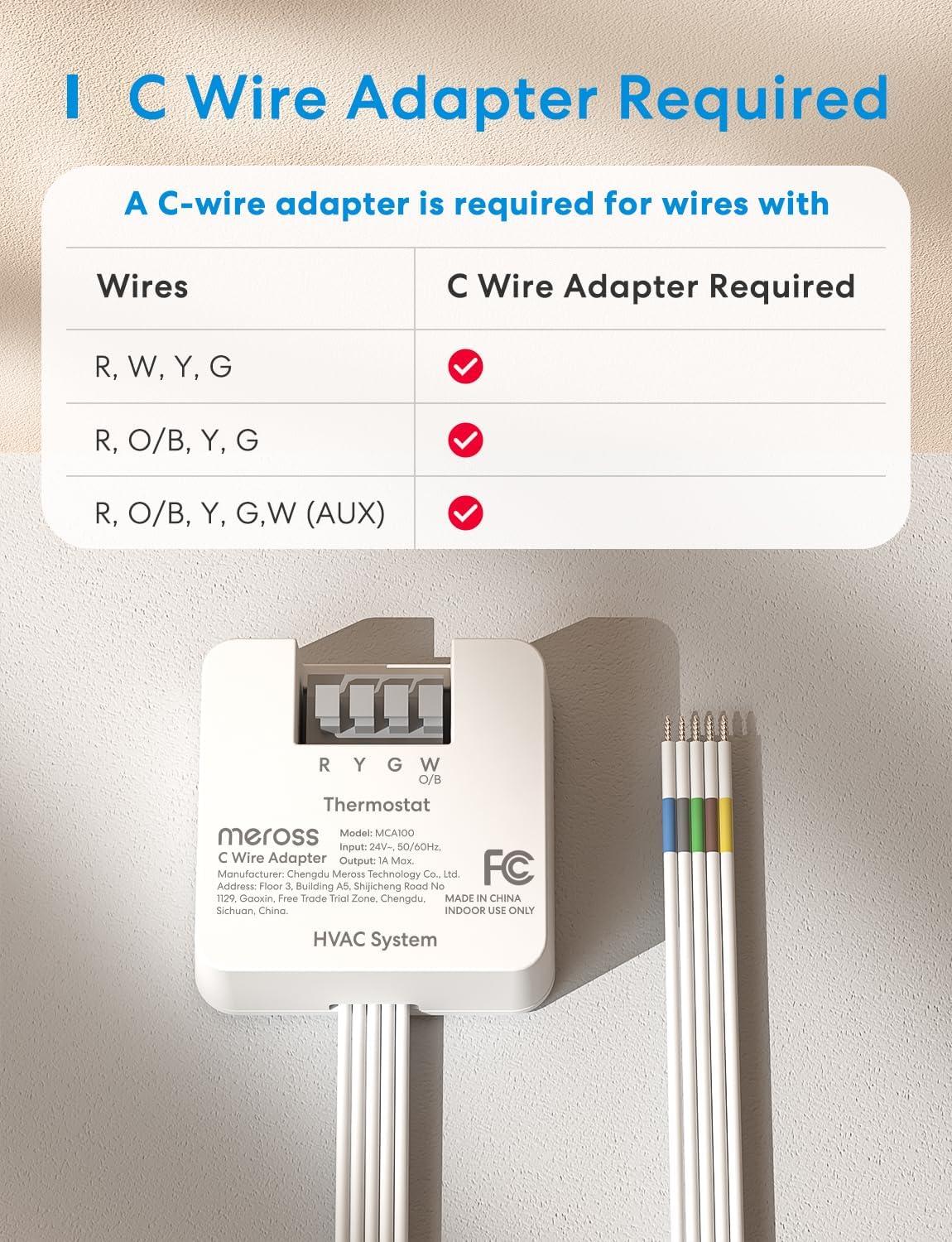 Note: This wifi thermostat requires a C-wire (common wire) for proper functionality. If your HVAC system does not have one, you can search for “meross C-wire adapter”to purchase a compatible adapter. This thermostat only supports 2.4GHz Wi-Fi networks