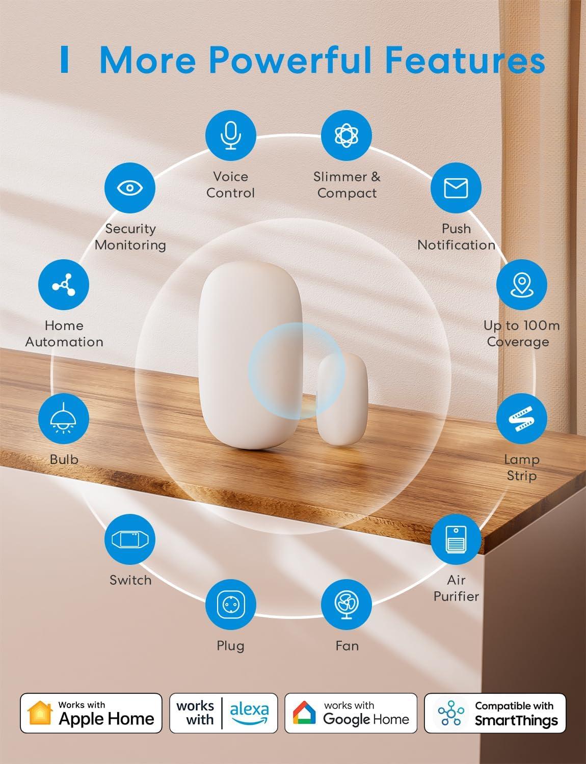 meross Smart WiFi Door & Window Sensor Kit, Support Apple HomeKit, Alexa, Google, SmartThings for Burglar Alert, 328ft Range, Home Automation, Security & Kid Safety, 2.4GHz WiFi, Meross Hub Included(Sensor+Hub Kit)